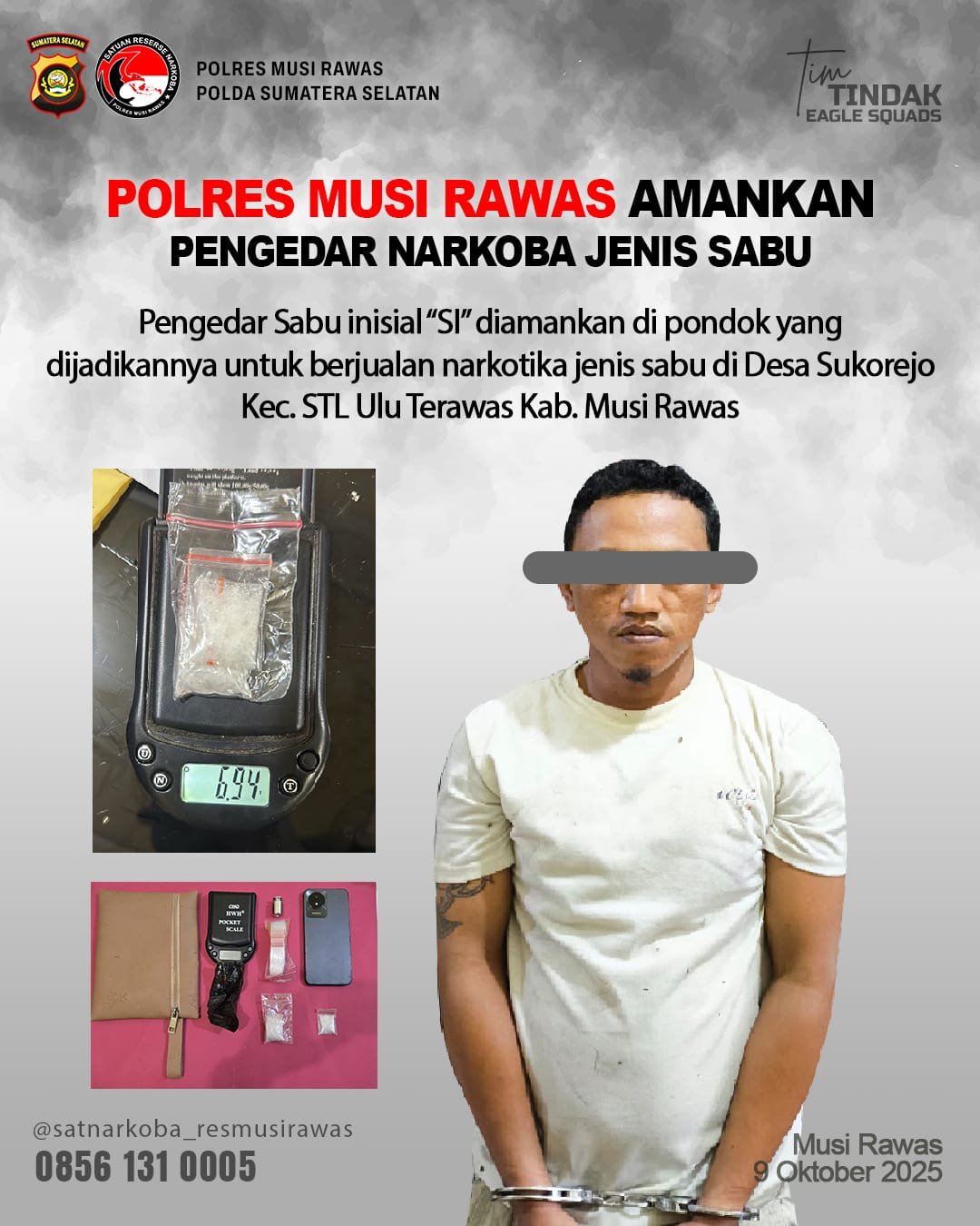 “Kami ucapkan terima kasih kepada masyarakat yang telah memberikan informasi, sehingga Pelaku inisial SI dapat diamankan (9/10/25), saat ini ianya sudah kami tetapkan sebagai Tersangka Tindak Pidana Narkotika dengan sangkaan pasal 114 ayat (2) dan atau 112 ayat (2) UU 35 tahun 2009” ujar Kapolres.
