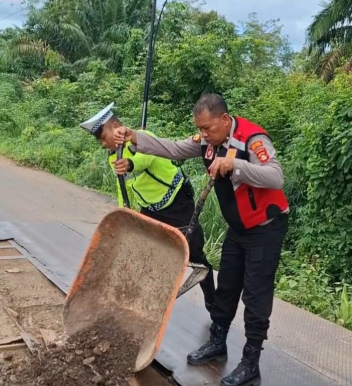 Menindaklanjuti kondisi tersebut, Kapolsek BTS Ulu, bersama personel turun langsung melakukan perbaikan sementara guna meminimalisir risiko kecelakaan serta memberikan rasa aman dan nyaman bagi pengguna jalan.