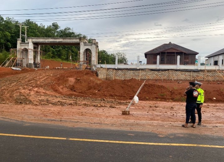 Satlantas Polres Musi Rawas (Mura), melihat kondisi Jalan Lintas Sumatera (Jalinsum), tepatnya didepan proses Pembangunan Pendopoan Rumah Dinas Bupati Mura, licin akibat jatuhnya tanah dan material yang jatuh kebadan jalan.
