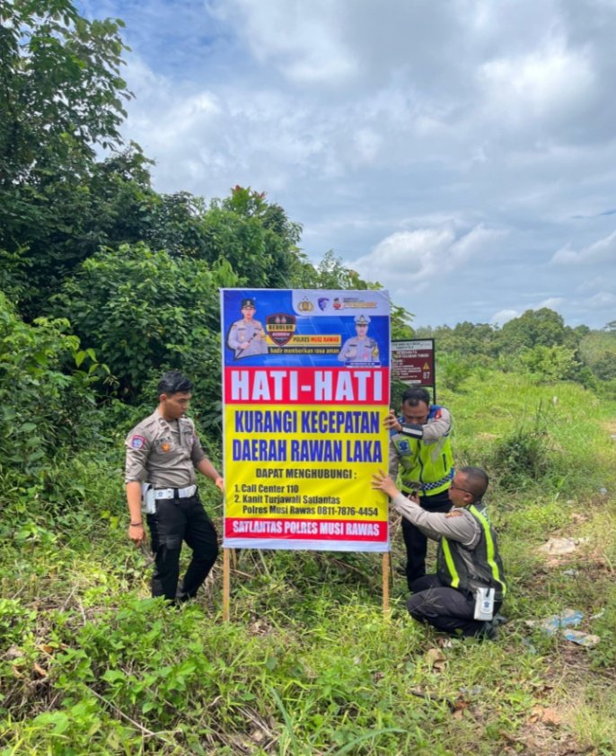 MUSI RAWAS-Satlantas Polres Musi Rawas, melakukan pemasangan Spanduk Himbauan Daerah Rawan Lakalantas di Jalan Lintas Kabupaten Musi Rawas-Pali, tepatnya di Desa Tambangan, Kecamatan BTS Ulu, Kabupaten Musi Rawas, Rabu (17/12/2025).