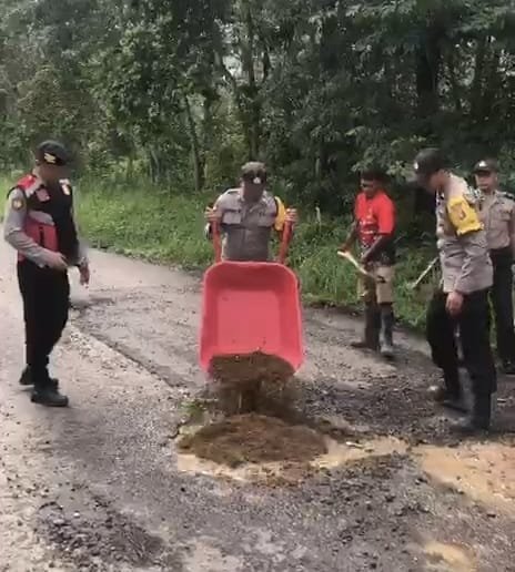 Kapolsek BTS Ulu Polres Musi Rawas Respon Cepat Timbun Jalan Berlubang Cegah Kecelakaan,,,