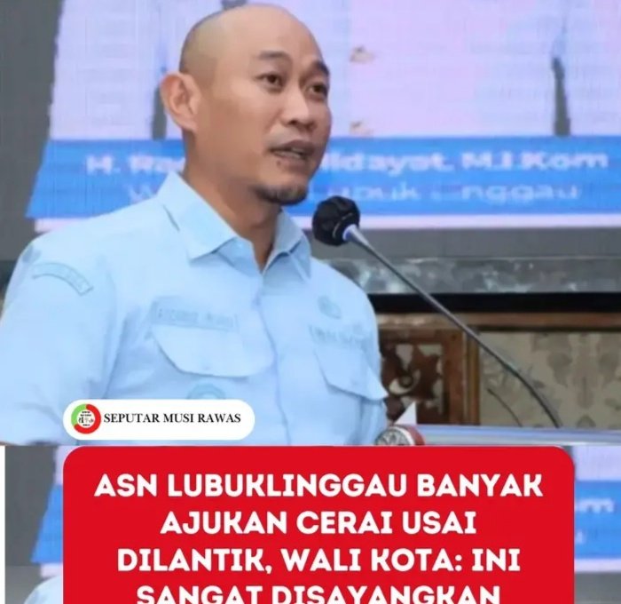 LUBUKLINGGAU SUMATERA SELATAN,,tandatangani surat pengajuan perceraian yang diajukan belasan ASN tersebut. Menurut Wali Kota Lubuklinggau H Rachmat Hidayat (Yoppy Karim), ada sekitar 15 ASN yang mengajukan permohonan perceraian yang telah pula ia tandatangani. Menurut Wali Kota, mayoritas alasan ASN ini mengajukan cerai karena motif ekonomi hingga mengaku sudah tidak ada kecocokan lagi dalam membina rumah tangga://media nasional tuntas MNT TV//