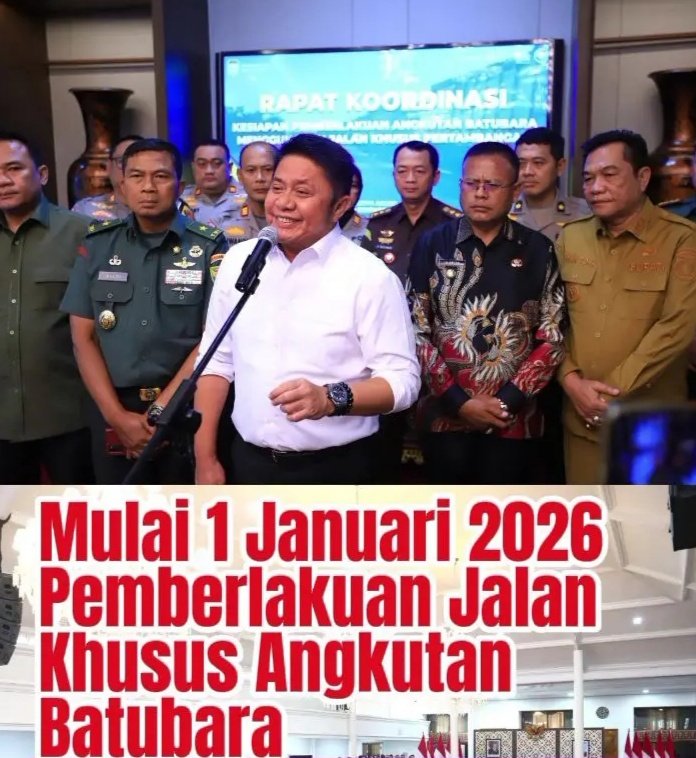 GUBERNUR SUMATERA SELATAN (Sumsel) Dr. H. Herman Deru menghadiri Rapat Koordinasi (Rakor) Kesiapan Pemberlakuan Angkutan Batubara Menggunakan Jalan Khusus Pertambangan bersama Forum Koordinasi Pimpinan Daerah (Forkopimda) Provinsi serta kabupaten/kota se-Sumsel di Griya Agung, Selasa (30/12/2025) siang.