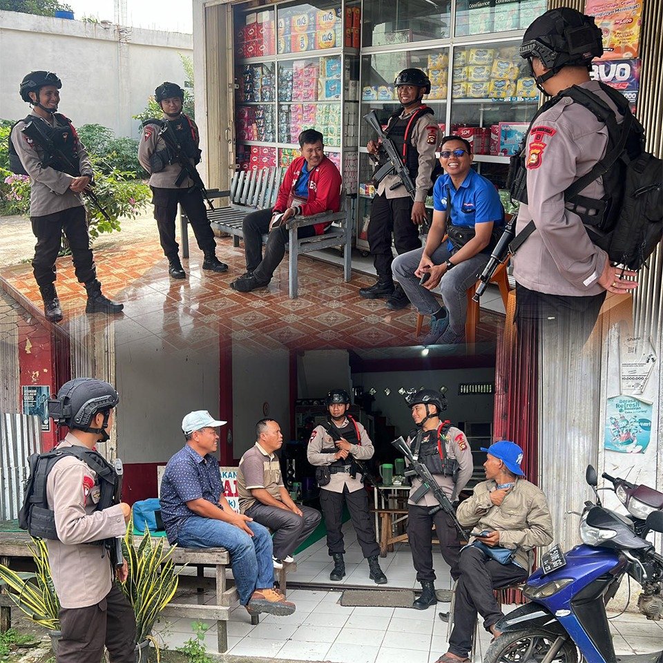Terlihat personel Brimob berdialog santai dengan masyarakat, mendengarkan aspirasi serta menyampaikan himbauan kamtibmas agar warga tetap waspada dan turut berperan aktif dalam menjaga keamanan lingkungan sekitar. Kehadiran aparat bersenjata lengkap namun bersikap ramah ini mencerminkan kesiapsiagaan sekaligus kedekatan Polri dengan masyarakat.
