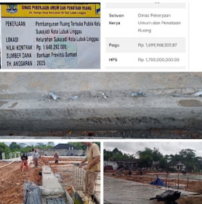 Pengerjaan proyek Pembangunan Ruang Terbuka Publik, yang berlokasi di Kelurahan Sukajadi, Kecamatan Barat I, Kota lubuk Linggau,, Jumat 02/ Januari 2026: